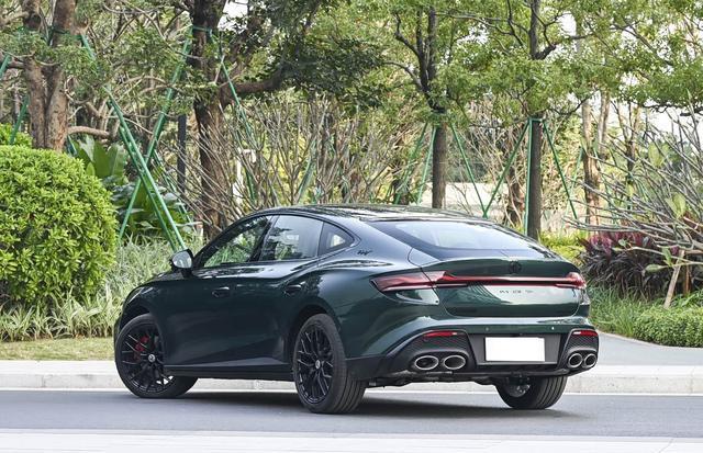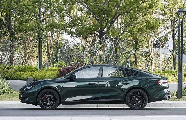 再来看车身侧面部分,4884mm修长车身通过"豹跃肩线"勾勒出超低风阻系数。无框车门与溜背式车顶的经典组合,既保留了GT跑车的优雅气质,又通过B柱后的快速下坠设计确保了后排头部空间。19英寸五辐式轮毂采用轻量化设计,搭配红色卡钳与米其林PS4轮胎,在静止状态下已蓄满运动张力。车身侧面的"三重奏"腰线设计,通过光影变化营造出肌肉感十足的视觉效果。
